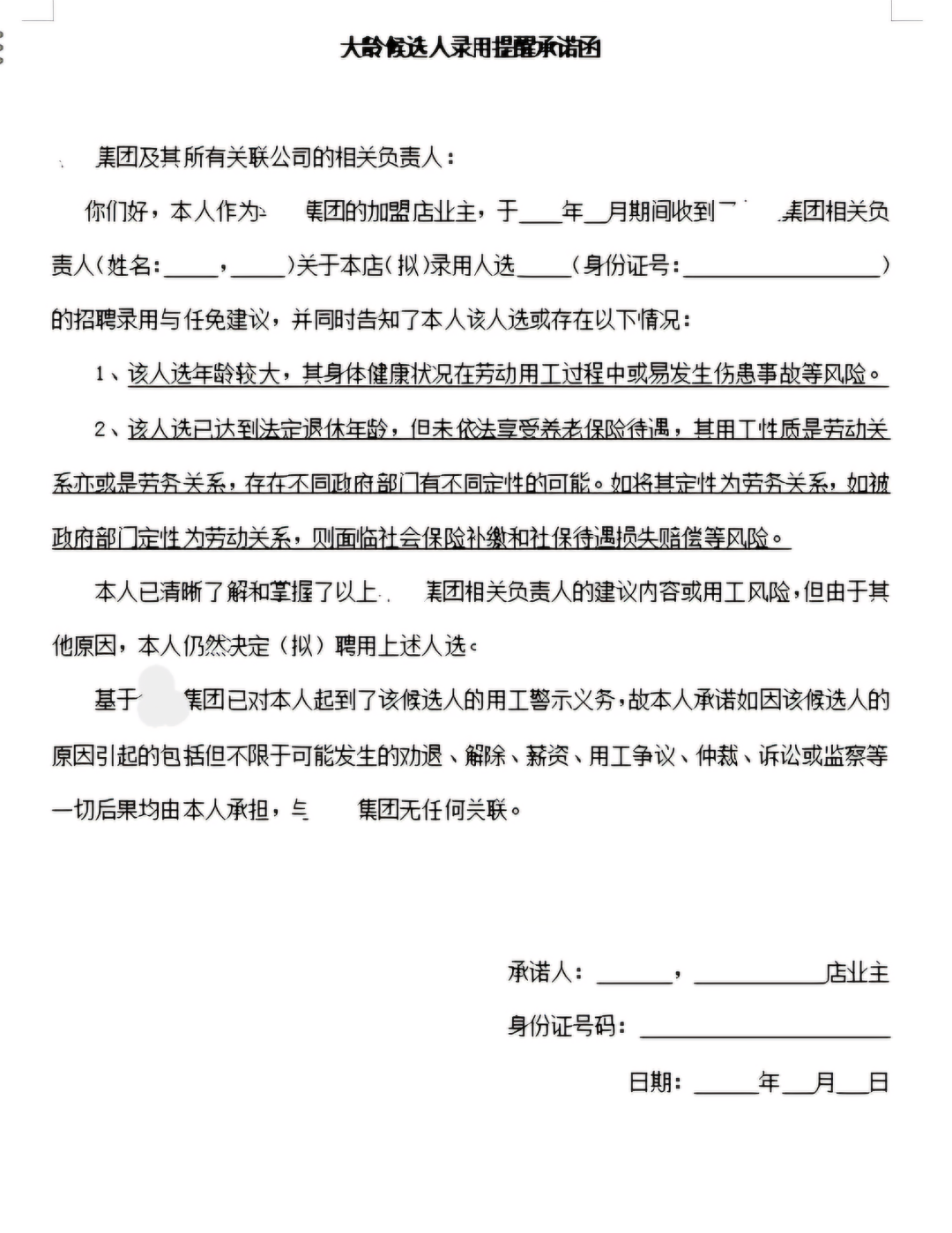 前两天,我看到一个酒店加盟商群里在讨论一件事:大龄员工还能不能用了?事情起因是,一名某连锁酒店集团的加盟商A总在准备雇佣一名60岁以上的老年员工时,收到了一份该集团下发的“大龄候选人录用提醒承诺函”。