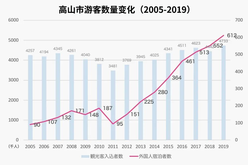 坐落在岐阜县阿尔卑斯山群山之中的高山市,被称作「陆地上的孤岛」,距离任何一个大城市都有火车两小时以上的距离。但是如今,它却成为了日本最受海外游客欢迎的地区之一,从2005年到2019年,高山市外国客人人数从9万人上升为约61万人,增长了近7倍,也达到常住人口的7倍。