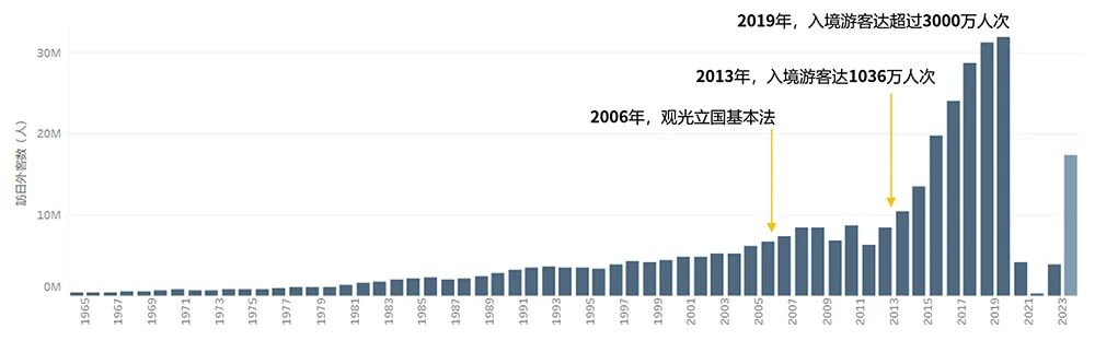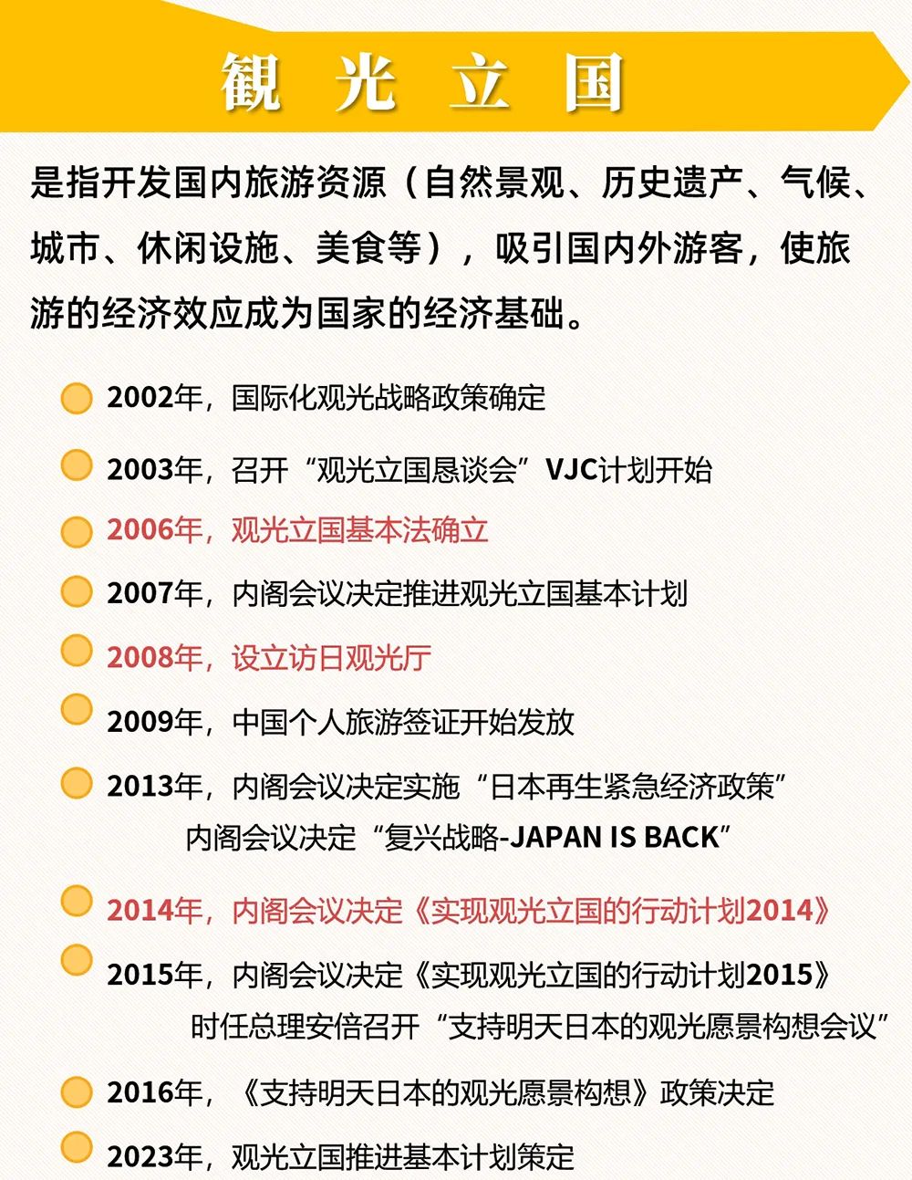 上世纪90年代的经济长期低迷,让日本政府重新开始关注入境游,并很快将举国振兴观光业确立为国家政策,也就是所谓的「观光立国」战略,即通过开发国内旅游资源(自然景观、历史遗产、气候、城市、休闲设施、美食等),吸引国内外游客,使旅游的经济效应成为国家的经济基础。