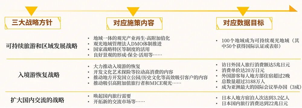 进入后疫情时代,日本的观光政策开始进入「2.0」时代——从关注「人数增量」到关注「消费深度」。具体而言,一是要提升游客的人均消费水平,增加旅游产业收入;二是要开发新的体验,推动游客从三大都市圈走向偏远地区,从而带动地域激活。