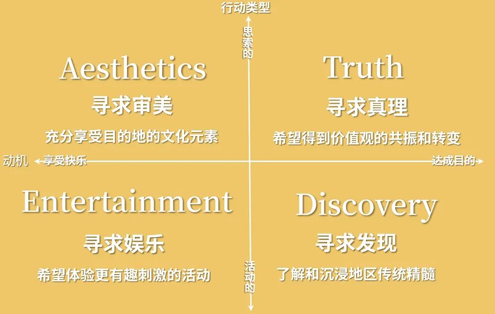 区别于其父辈的「传统奢华」需求(私人飞机、奢侈品等身份象征的服务),他们更倾向于「现代奢华」的体验——希望挑战新事物,对体验的看重多于奢华,希望获得一生一次的经历。而他们的旅行诉求,可以被概括为四大关键词——审美、娱乐、真理、发现。