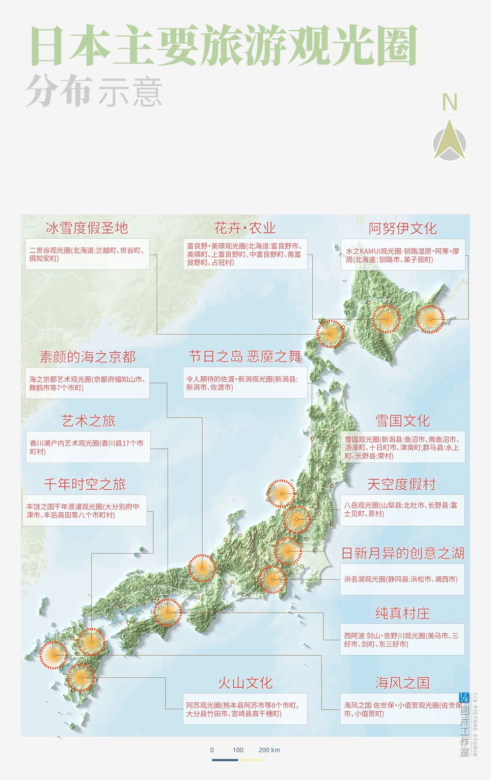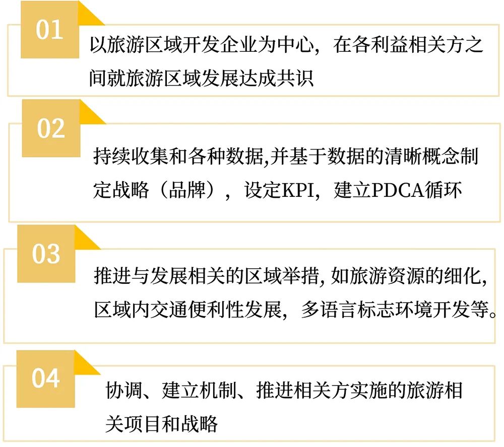 正如日本豪华旅游振兴机构代表董事,宫山直之所说:「我认为政府倾向于只考虑促进该地区的发展。但旅行者旅行的目的并不是「去XX县」,而是因为寻找「哪里吃、哪里住、玩什么」的旅行过程和故事」。日本已经划定了十三个观光圈,都是通过DMO组织的协同合作实现主题观光目的地打造。