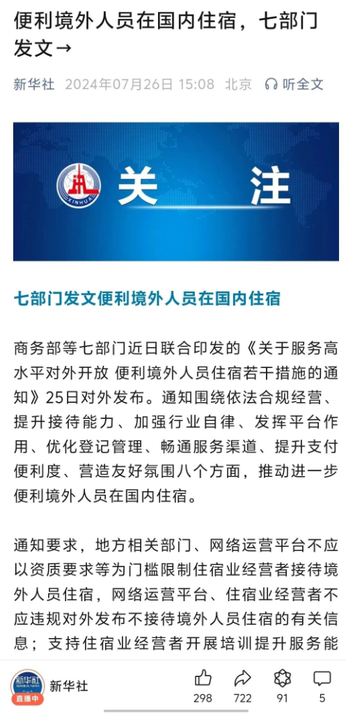 通知围绕依法合规经营、提升酒店接待能力、加强行业自律、发挥平台作用、优化登记管理、畅通服务渠道、提升支付便利度、营造友好氛围八个方面,推动进一步便利境外人员在国内住宿。通知要求,地方相关部门、网络运营平台不应以资质要求等为门槛限制住宿业经营者接待境外人员住宿,网络运营平台、住宿业经营者不应违规对外发布不接待境外人员住宿的有关信息;支持住宿业经营者开展培训提升服务能力,强化行业自律,确保经营行为符合法律法规和消费者权益保护规范;压实网络运营平台责任,加强对入驻商家发布信息审核把关;进一步优化住宿业经营者对境外人员住宿登记的管理服务工作,简化信息采集项目,坚持教育管理先行,包容审慎执法;完善境外人员沟通服务渠道,持续推动提升住宿领域支付便利度,营造良好涉外服务环境。通知还称,下一步,商务部将会同相关部门指导地方抓好便利境外人员住宿相关措施的落实落地,为境外人员提供更加便利友好的住宿环境,更好服务高水平开放和高质量发展。值得注意的是,《通知》重点提到地方相关部门不应以资质要求等为门槛限制住宿业经营者接待境外人员住宿,这一点在旅界之前报道的《为什么很多酒店不愿意接待老外?》里也曾提及:不少酒店业者曾因为当地有一套“能否接待老外入住”的政策而苦恼。因此,老外入住酒店的规则标准能否统一?这其实一直是酒店业界关心的问题。除此之外,《通知》几次三番提及网络运营平台,包括不应违规对外发布不接待境外人员住宿的有关信息。目前携程、华住等头部在线旅游企业、酒店集团的网站都有酒店能否接待外宾的醒目标识,未来随着国内酒店向老外全面开放,这个标识的作用的确作用似乎不大了。事实上,这个《通知》可以理解为今年5月底,公安部、商务部、国家移民局针对网民反映的境外人员住宿不便问题,要求旅馆业不得以无涉外资质为由拒绝接待境外人员,指导监督旅馆业进一步改进涉外接待服务能力,提升从业人员服务水平的“细则版本”。旅界从业界获悉,今年5月以来,外国人入住国内酒店的确得到相当大程度改善,尤其上海已经做到均可接待老外入住。上海淮海公馆漫心府店长潘文莉向旅界表示,此前,酒店外卡支付额度是2000元左右,现在提升到20万元。“如今,入境客人的登记流程更加便利了,酒店新添置了登记设备,扫描入境客人的护照,信息就可以直接登入系统。相比于国内客人,入境客人需要登记的信息更多,此前是手工登记,速度比较慢,现在速度明显提升了。”不难看出,144小时过境免签、向多国游客免签证后,解决愈来愈多的老外“住宿烦恼”已经成了这个暑期最重要的课题之一。今年5月前,社交媒体上还不乏一些老外来中国因为入住酒店困难而发牢骚的视频抑或帖子。4月,一名外籍旅客玛丽在小红书发帖称自己河南之旅住宿方面一言难尽,“原先在trip.com(携程海外版)选的郑州和洛阳酒店前前后后四次都被酒店reject 了,不是说接不了外宾就是在装修。trip.com的客服每次都会帮忙找酒店replace,服务态度真心不错。”最让玛丽感到蹊跷的是精挑细选能入住的“可接待外宾酒店”后,万万没想到最后一晚在郑州机场附近的酒店踩雷了。玛丽说,”这一区的酒店几乎都有提供免费机场接送服务。到了机场打电话给酒店安排接送时,前台人员突然问起我们是外宾吗?她说接不了外宾。”玛丽仿佛遭遇晴天霹雳,“我的妈呀!trip.com怎么没察觉?”她在网上看到这间酒店的规定的确可以接外宾,没办法,只好登陆trip.com 联络客服。客服也吓了一跳,答应马上找个新住宿给她们。玛丽在机场等了半小时,trip.com发了新的酒店订单,到了酒店她才发现原来这两家酒店是邻居,还共享一个电梯,但一家酒店可以接外宾,另一家酒店不接外宾。