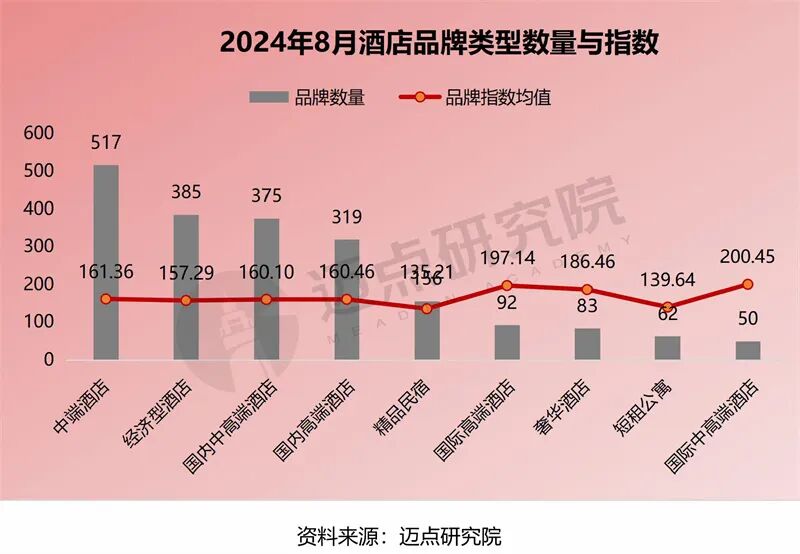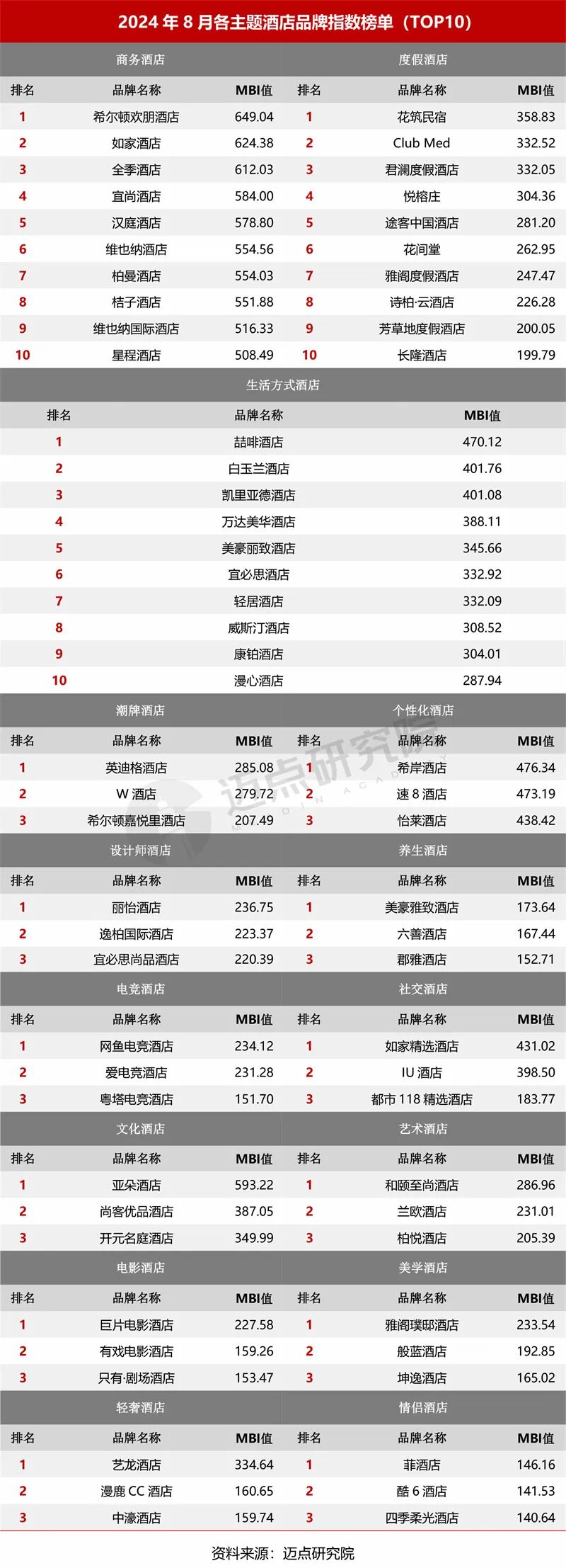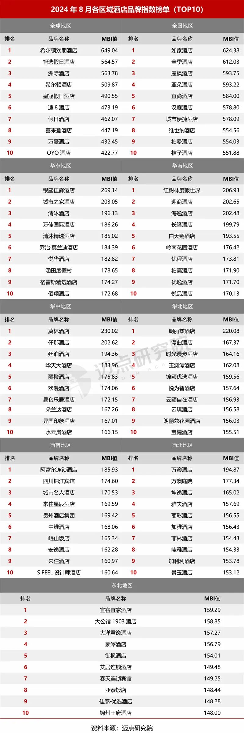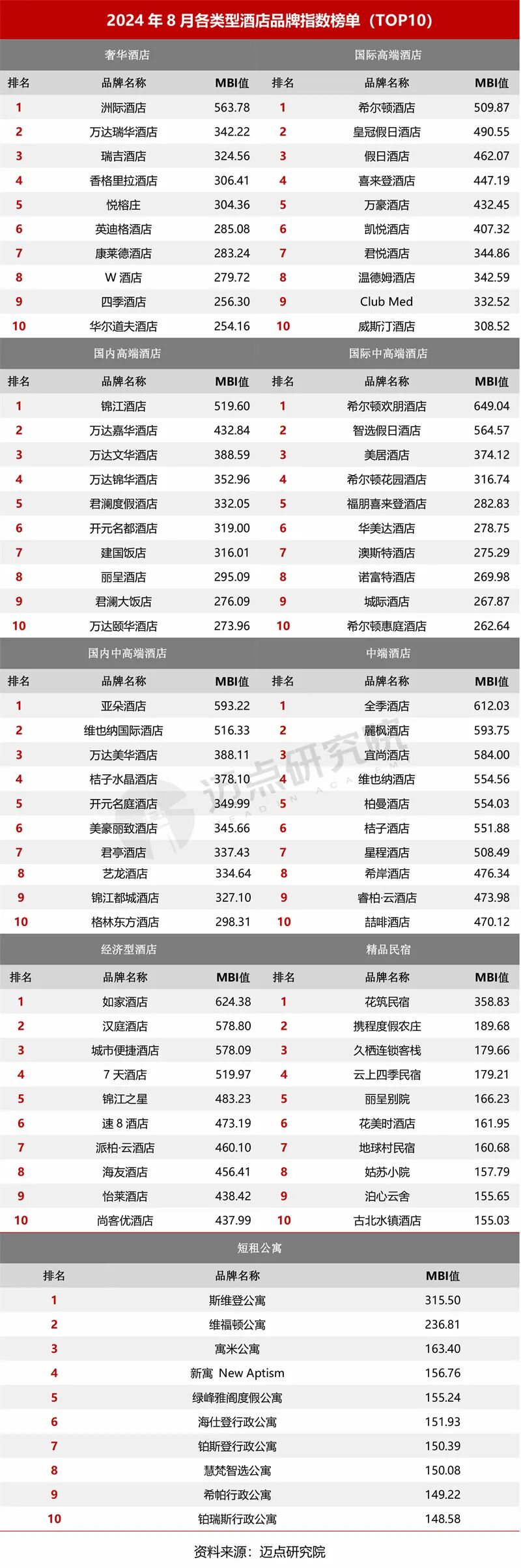 “2024年8月中国酒店业发展报告”数据来源于迈点品牌指数MBI,根据8月迈点MBI九大旅游住宿业品牌类目中的2039个品牌数据汇总统计而成。具体说明如下:迈点品牌指数MBI(旅游住宿品牌部分)主要从媒体指数、点评指数、投资指数等3个维度来分析品牌在互联网和移动互联网的传播力。这是迈点研究院自主开发的“迈点品牌指数监测系统”Meadin Brand Index Monitoring System(MBIMS)提供的一项免费数据分析服务。注:MBI,指某品牌的迈点品牌指数MBI数据;a、b、c,指系统中的加权系数;MI(Media Index),指媒体指数;CI(Comment Index),指点评指数;II(Investment Index),指投资指数。注意:企业或个人可参照品牌指数数据对品牌发展进行监测和预测,但迈点品牌指数 MBI不能与其品牌发展完全等同。(1)媒体指数(MI):一段时期内,主流媒体、大众媒体、行业媒体和自媒体报道中与品牌关键词相关的正面新闻数量,具体渠道包括人民日报、新华社、央视网、百度资讯、今日头条、腾讯、新浪、网易、搜狐、凤凰、迈点、中国旅游报、微信、微博、抖音、快手、小红书、视频号等。(2)点评指数(CI):一段时期内,用户对于该品牌下门店在各大OTA网站的点评累计情况,具体渠道包括携程、去哪儿、途家民宿、美团、大众点评、同程、艺龙、飞猪、小猪、途牛、马蜂窝、木鸟民宿等。(3)投资指数(II):一段时期内,该品牌在大中华区市场的门店加盟与开发情况,具体要素包括累计开业情况、新增开业情况、累计签约情况、新增签约情况、城市覆盖密度、投资业主关注等。2. 统计时间:2024年8月1日 – 8月31日3.监测范围:奢华酒店、国际高端酒店、国内高端酒店、国际中高端酒店、国内中高端酒店、中端酒店、经济型酒店、精品民宿、短租公寓等九大类目的2039个市场主流旅游住宿业品牌。基于百人团队的全时监测、超千种维度的数据抓取、5轮层层精校与自我审核,迈点品牌指数MBI最终得以化繁为简,将繁杂的数据表象精炼为客观指数并加以呈现。历经11年有余的数据积淀与深耕,迈点品牌指数MBI也日益成为洞察行业品牌发展变化的风向标。