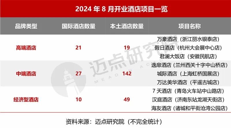 据迈点研究院不完全统计,2024年8月新开业酒店共计268家。酒店类型占比上,中端酒店最多,为169家;经济型酒店59家,高端酒店40家。