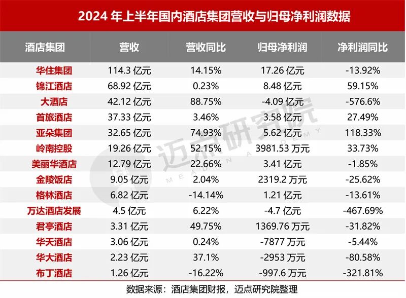 据迈点研究院不完全统计,上半年营收同比增长之最是大酒店,为88.75%,上半年净利润同比增长之最是亚朵集团,为118.33%。
