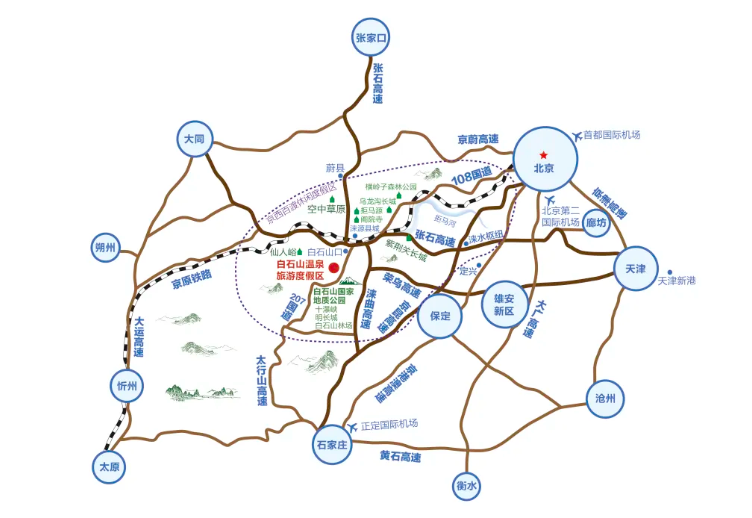 自驾:北京出发驶入京昆高速转荣乌高速,到涞源南下高速沿207国道西行3公里到达白石山温泉旅游度假区。