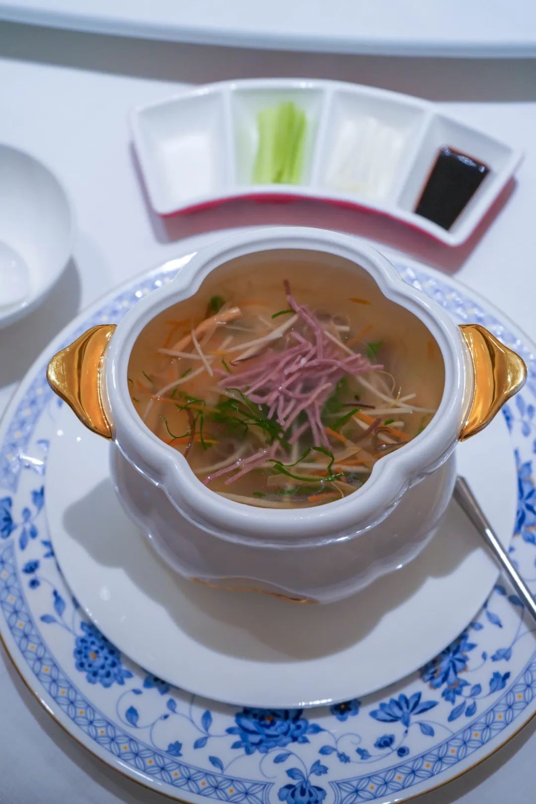 上文中的曹雪芹故居纪念馆是由新世界中国完成复建的,且由新世界集团旗下的K11负责运营。更巧的是距离纪念馆仅有不到10分钟车程的地方,就是北京新世界酒店。在酒店的北京宴中餐厅,我吃到了灵感源自《红楼梦》书中的火腿鲜笋汤(第五十八回)和糖蒸酥酪(第十九回)。