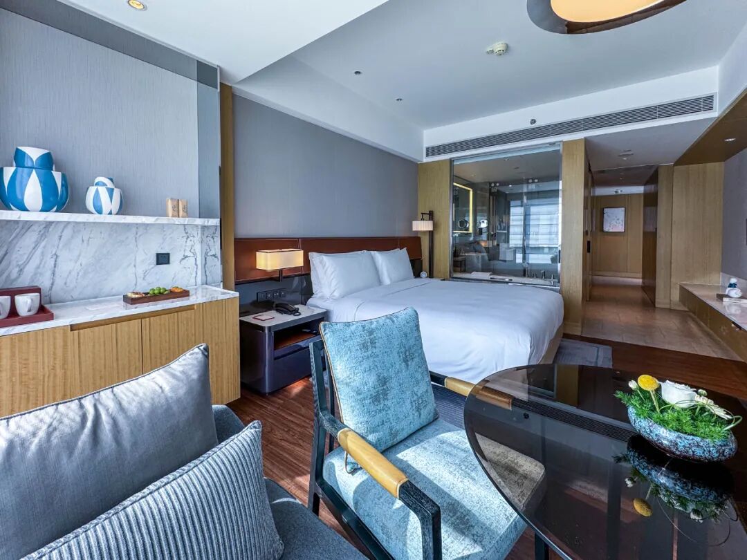 客房风格非当下流行的原木暖色调,装饰上以东方传统的“留白”美学, 营造意境。搭配实木地板、浅绿色地毯,让客房倍感温馨同时又典雅高贵。入住这间客房的宾客,可以前往聚贤荟(行政酒廊)享受每日精心准备的小吃和餐食,酒廊内不仅有远眺天坛的绝佳视角,更是搭配了一方户外露台,可以惬意放松,享受新鲜空气。