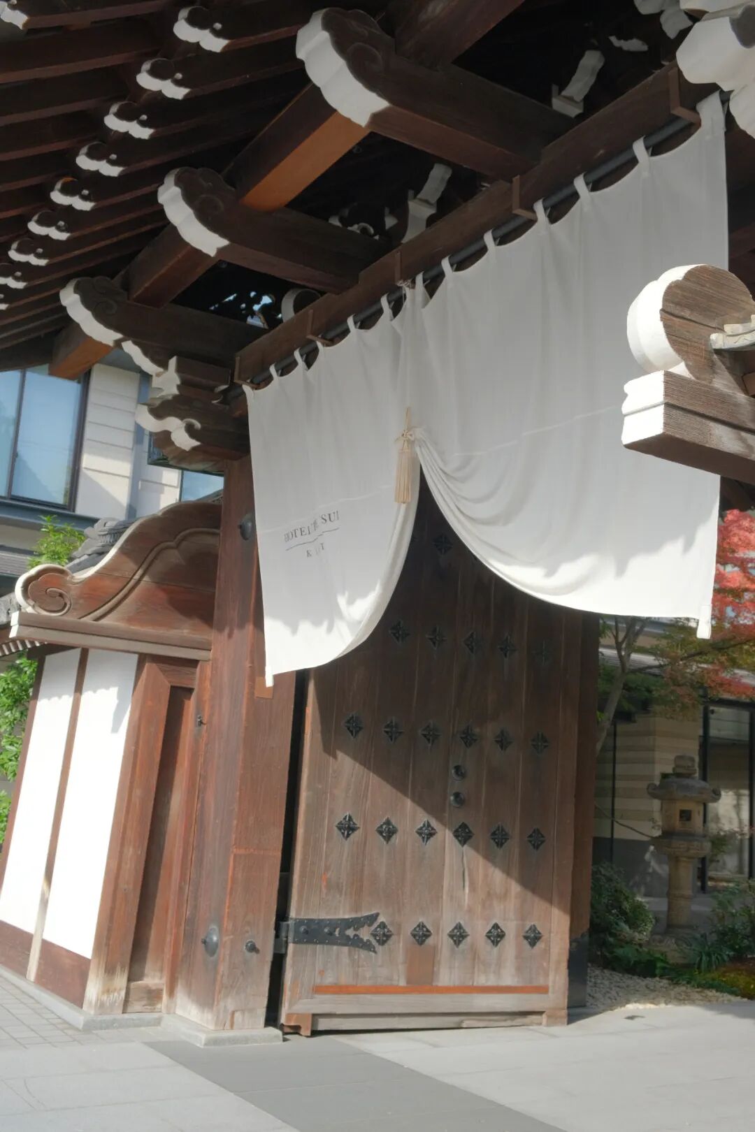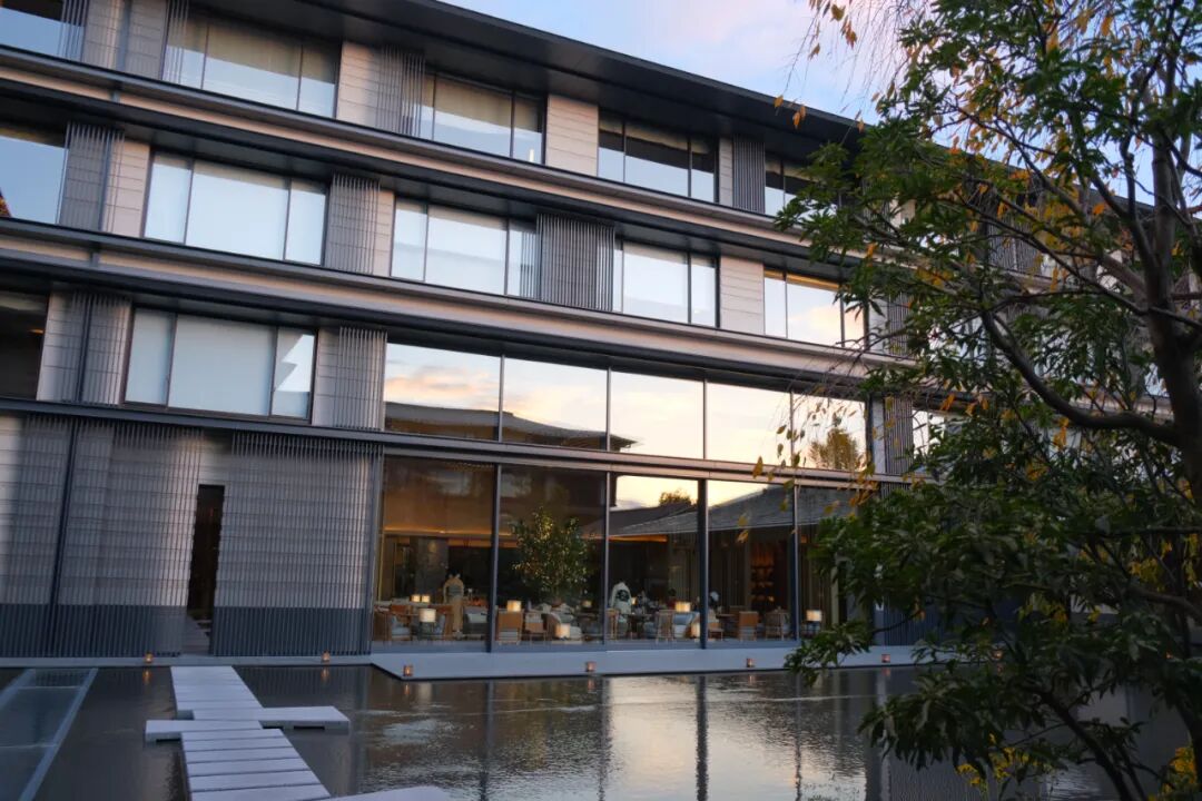 这个历史悠久的"梶井宫门"(The Kajiimiya Gate),其建造年代可追溯至1703年,是京都皇宫内通往梶宫的大门。1935年,大门被迁至三井家族的宅邸,该宅邸在此地已有250多年的历史。2021年7月,它被正式登记为有形文化遗产。梶井宫门以其和风木质结构与精美细致的雕刻工艺闻名,这个高7.4m的宫门,在经过修复还原后,80%以上都为原件,通过巧妙的灯光布局与自然元素如水池和庭园的搭配,使这座古门成为整个酒店的视觉与文化焦点。