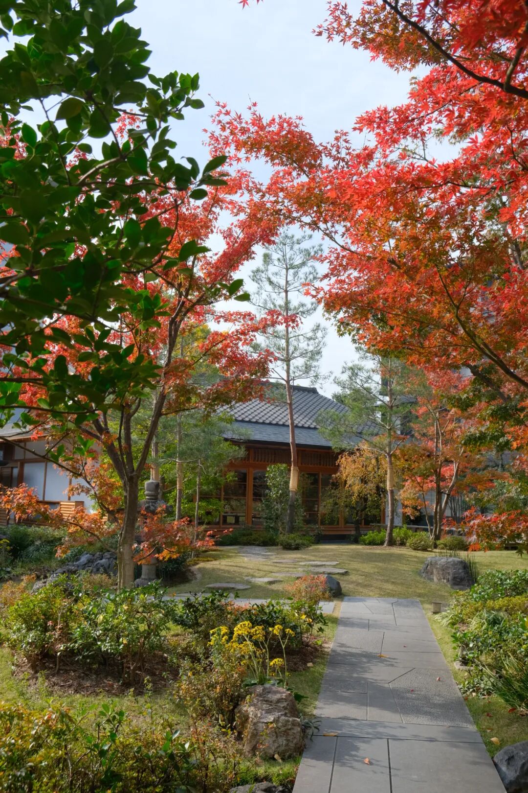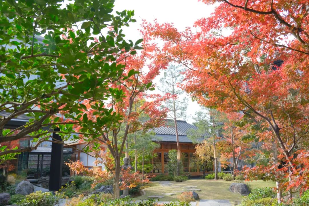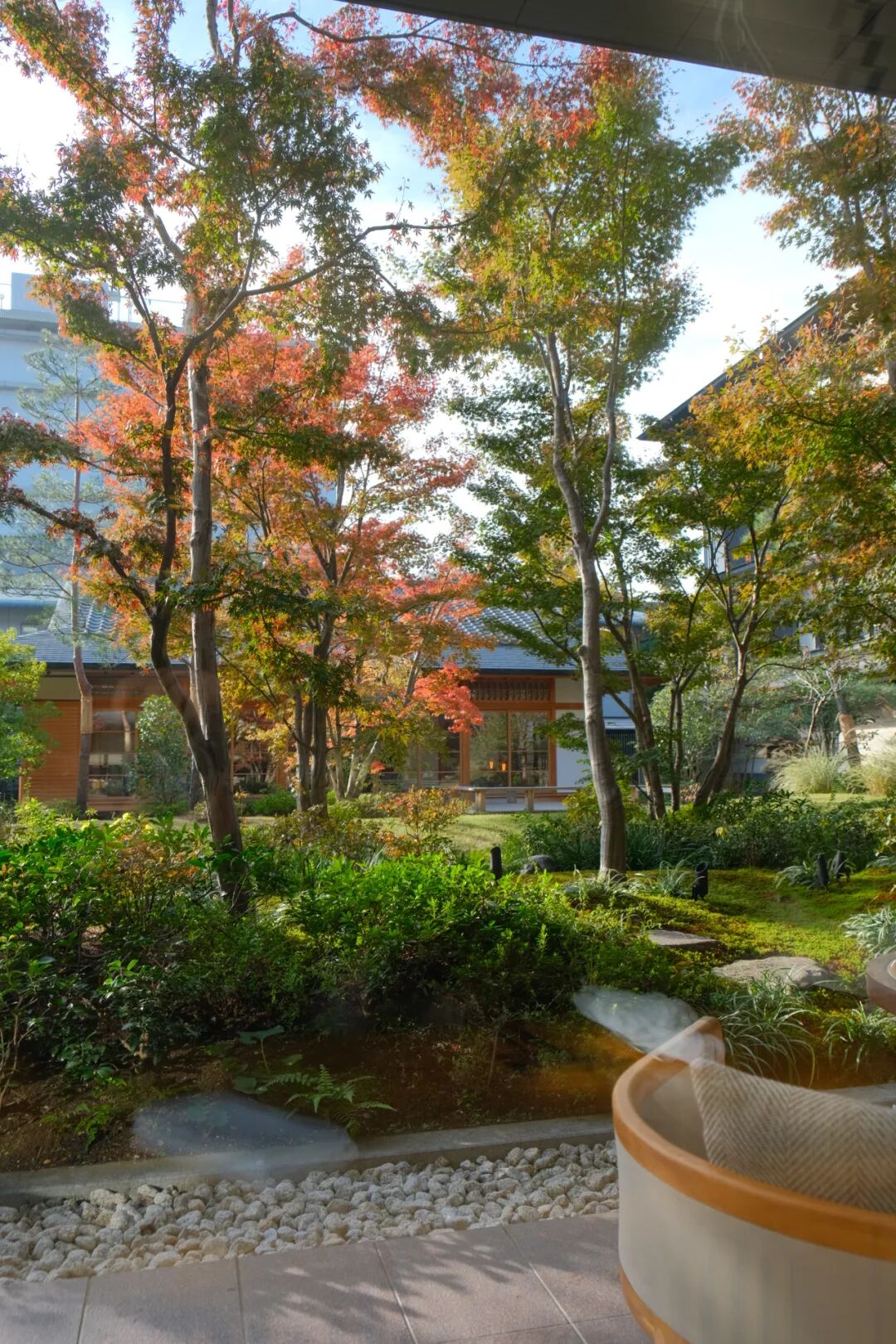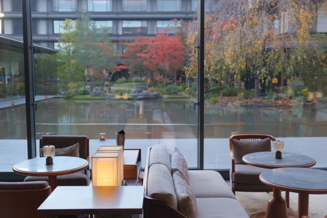 从酒店透过大幅落地玻璃往外看,有一处被时光温柔以待的秘境,那便是由“日本景观设计第一人”宫城俊作精心打造的约1300平米中庭。他巧妙地运用了“庭屋一如”的理念,将庭院与建筑融为一体。