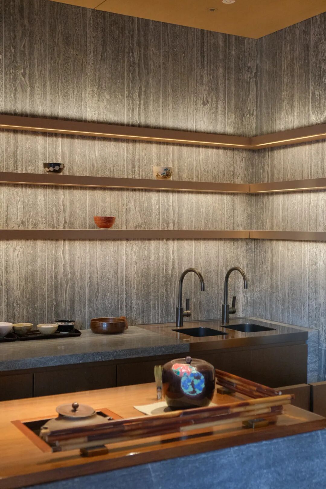 融入了抽象的水元素和大片的桦木,搭配京都传统工艺的细节,如侘寂风格的碗或苔藓盆栽。这种设计不仅展现了京都的传统美学,还赋予了空间现代的活力。
